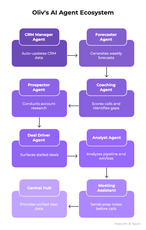 Flowchart illustrating Oliv's interconnected AI agent ecosystem where specialized agents—CRM Manager, Forecaster, Coaching, Prospector, Deal Driver, Analyst, and Meeting Assistant—work autonomously on unified deal-level data to eliminate manual workflows.